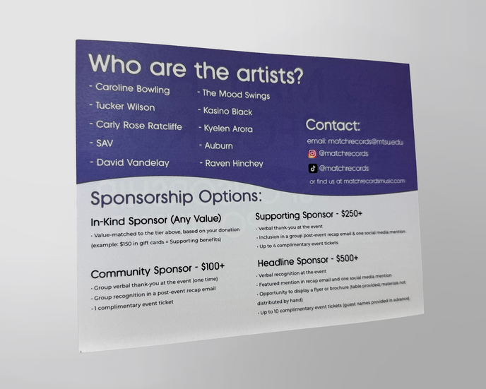 A sponsorship card made for Match Records meant to be handed out to local buisnesses. Created using Adobe Illustrator and InDesign.